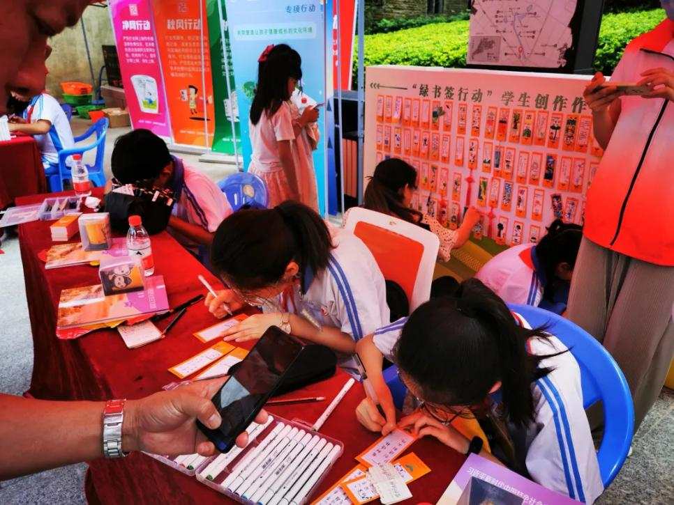 现场学生进行绘画创作,设置“绿书签行动”宣传区