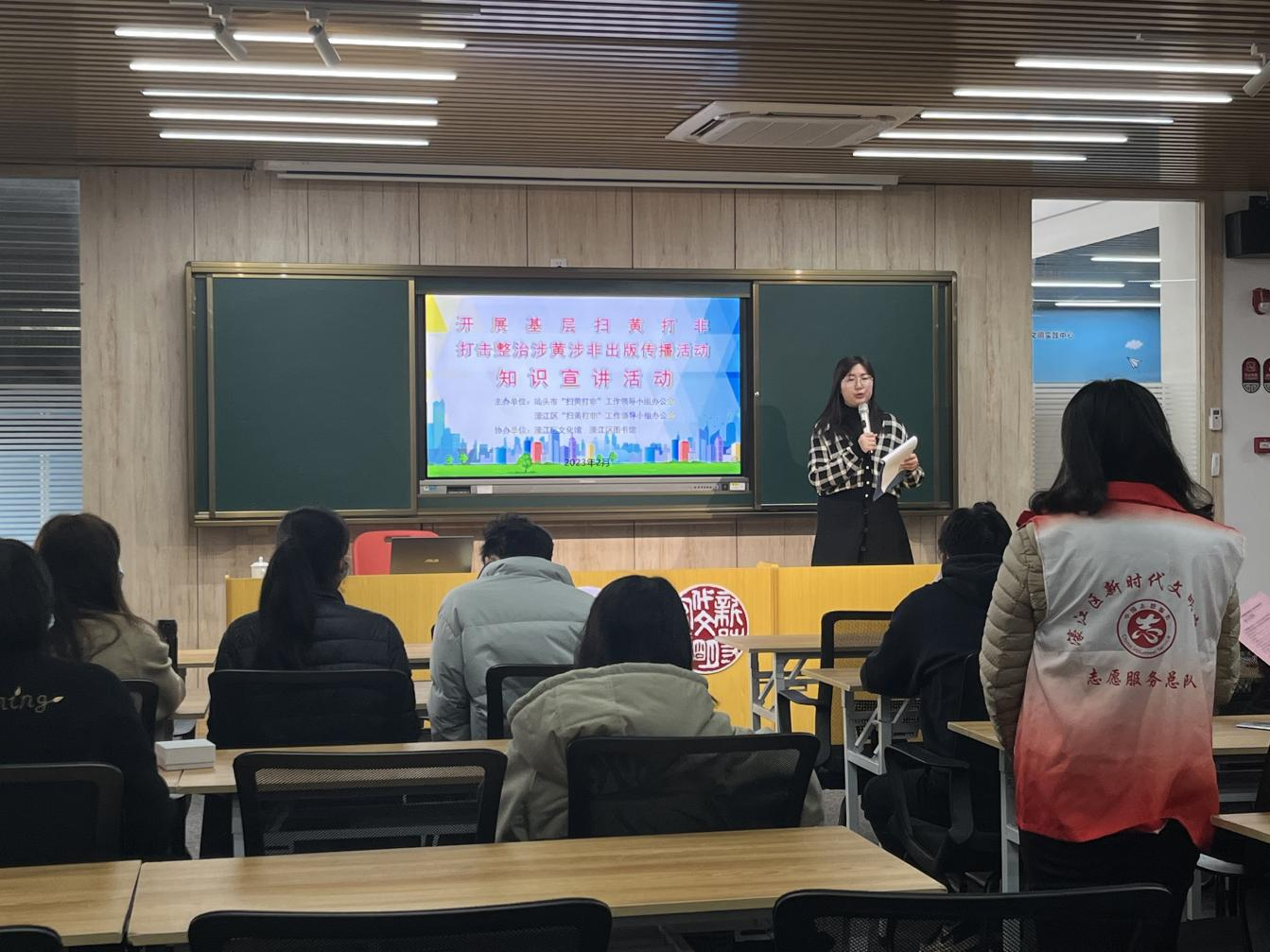 进一步推进“扫黄打非”进基层工作,营造健康、文明、和谐的文化环境,2月9日上午,汕头市“扫黄打非”办联合濠江区“扫黄打非”办在濠江区新时代文明实践中心举行了“开展基层扫黄打非,打击整治涉黄涉非出版传播活动”知识宣讲活动,濠江区各街道和社区负责宣传工作的干部参加了活动。