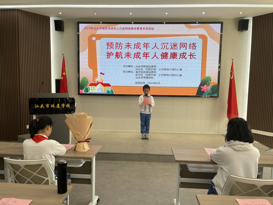 为引导广大青少年学生科学认识、正确对待、合理使用网络,预防沉迷网络,呵护未成年人身心健康成长,3月9日下午,汕头市“扫黄打非”办、市新闻出版局联合金平区新闻出版局、区“扫黄打非”办走进珠厦学校,组织开展预防未成年人沉迷网络宣传教育活动,来自珠厦学校的近100位学生参加活动。