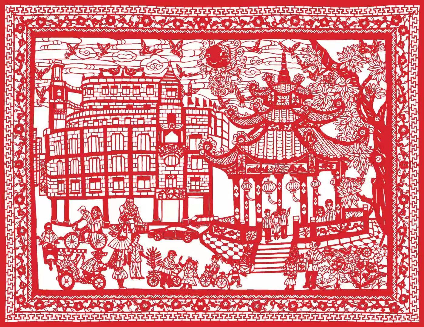 自1860开埠以来,作为百年商埠的汕头,城市百业发生深远改变。,小公园开埠区是其文明发展最佳见证。作品用潮汕非遗剪纸艺术体现了百载商埠的繁荣与昌盛。同时祝愿特区借旧貌成网红地标之机,迈上光明的城市发展复兴路。主题鲜明,创意独特。