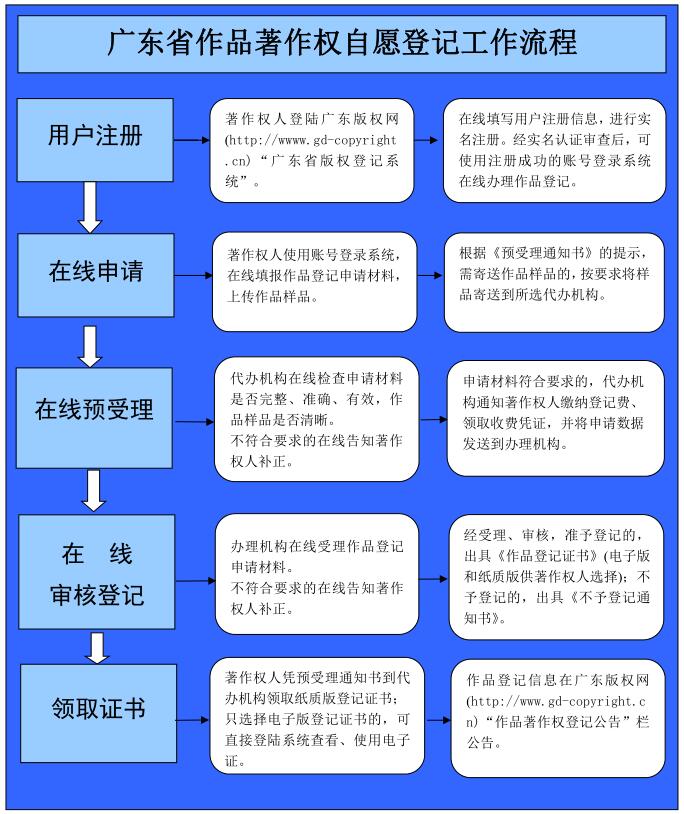 1.用户注册:为提升效率、保障数据安全,须由著作权人登录“广东版权网”(http://www.gd-copyright.cn)“广东省版权登记系统”(简称:版权登记系统),进行用户注册。用户注册采取实名制,在线提交身份证明及注册确认书。注册成功,可使用账号登陆系统在线办理作品登记。